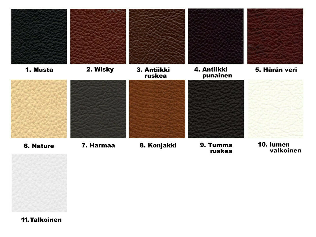 Päällinen: Kulutuspinnoilla korkealaatuinen läpivärjätty Madras-nahka, taustat keinonahkaa. Saatavana useissa eri värivaihtoehdoissa.