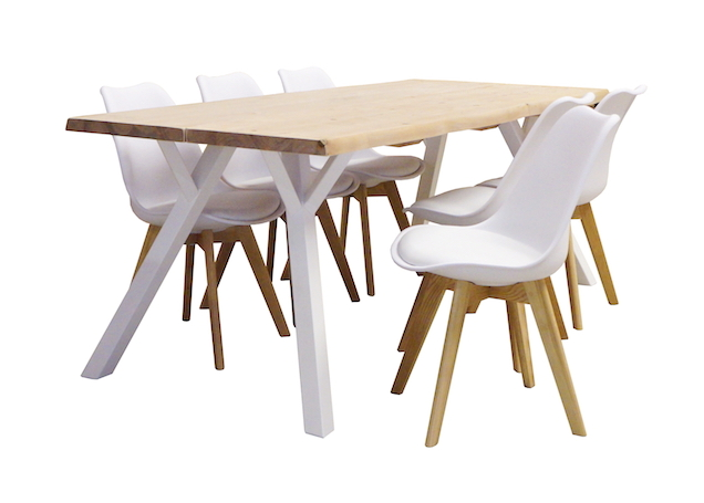 Suosittu Lana-ruokapöytä harjatulla massiivipuukannella. Pöytään voi yhdistellä monenlaisia tuoleja.