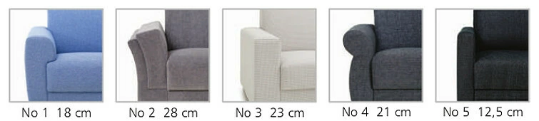 Voit valita sohvaan haluamasi käsinojamallin viidestä eri vaihtoehdosta. Huomioithan, että käsinojan malli vaikuttaa sohvan kokonaisleveyteen. Kuvien sohvissa on käsinojamalli 4.