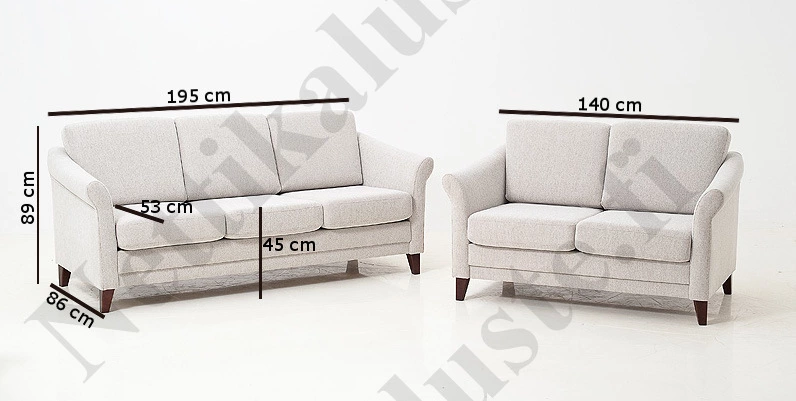 Istuinkorkeus ja -syvyys ovat toteutettu hillitysti, joten sohvissa on erittäin mukava istua. Istuimissa on siksak-jousitus sekä korkealaatuinen vaahtomuovi/vanu istuintyyny. Pehmeähköt selkätyynyt ovat vanu/silikonikuitutäytteiset.