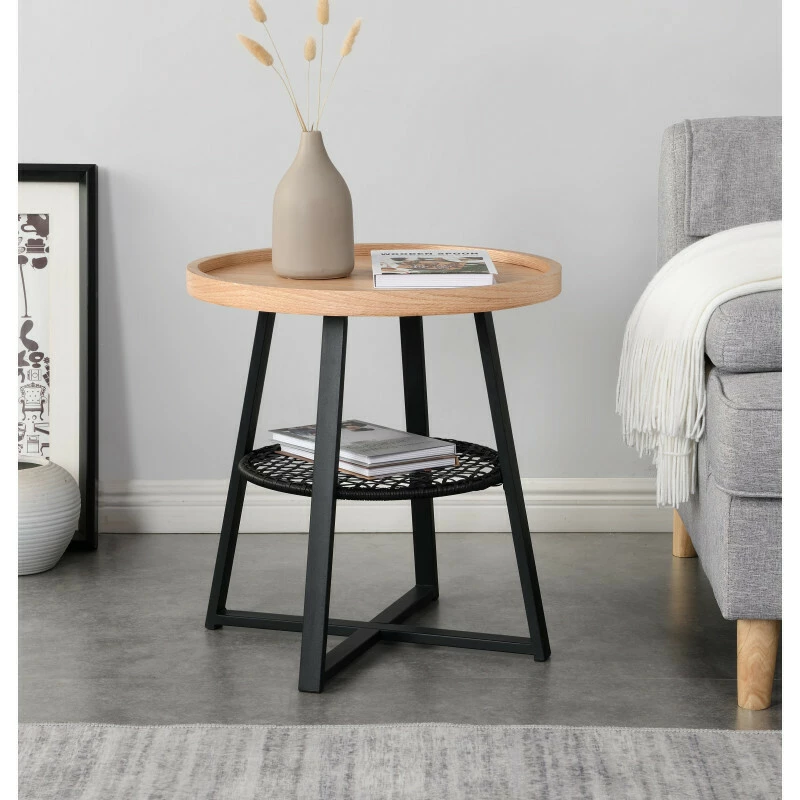 Mode sohvapöytä on trendikäs yhdistelmä mustaksi maalattua metallia ja luonnollista tammea. Pöydässä on muovirottingista punottu alataso, joka tarjoaa mukavasti säilytystilaa pikkutavaroille.