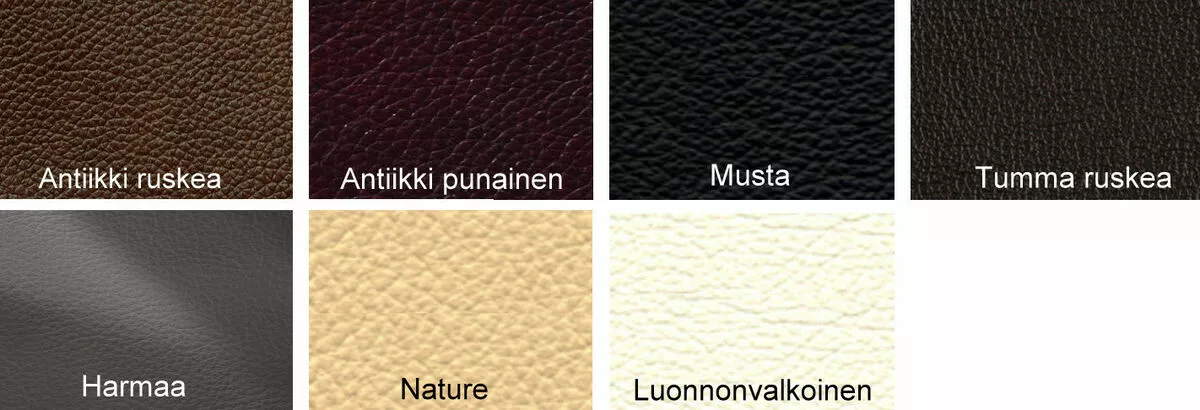 - Kaikki kulutuspinnat verhoiltu laadukkaalla, läpivärjätyllä MADRAS-nahalla. Taustat keinonahkaa