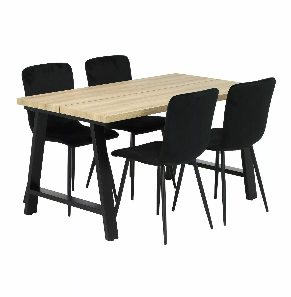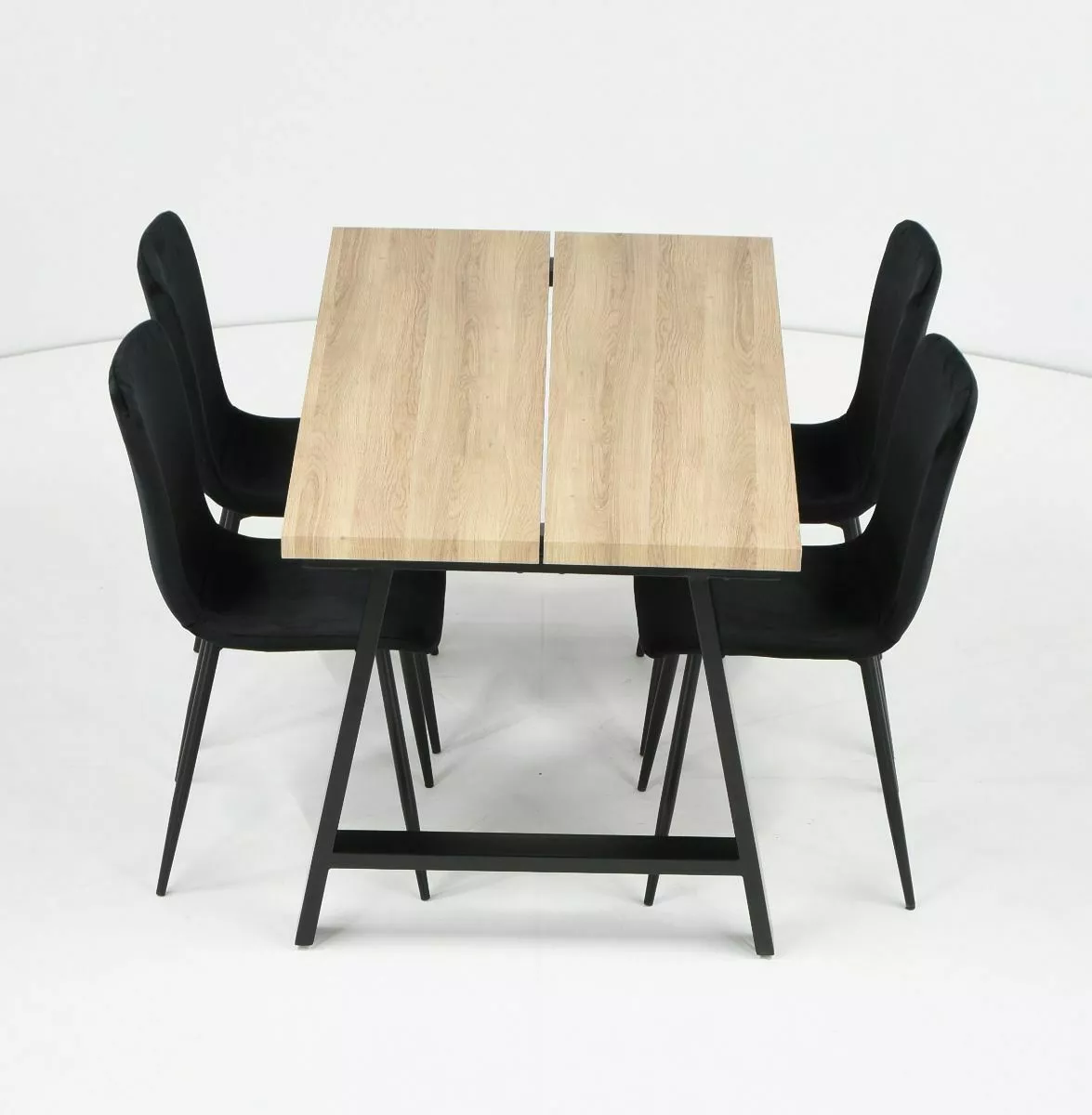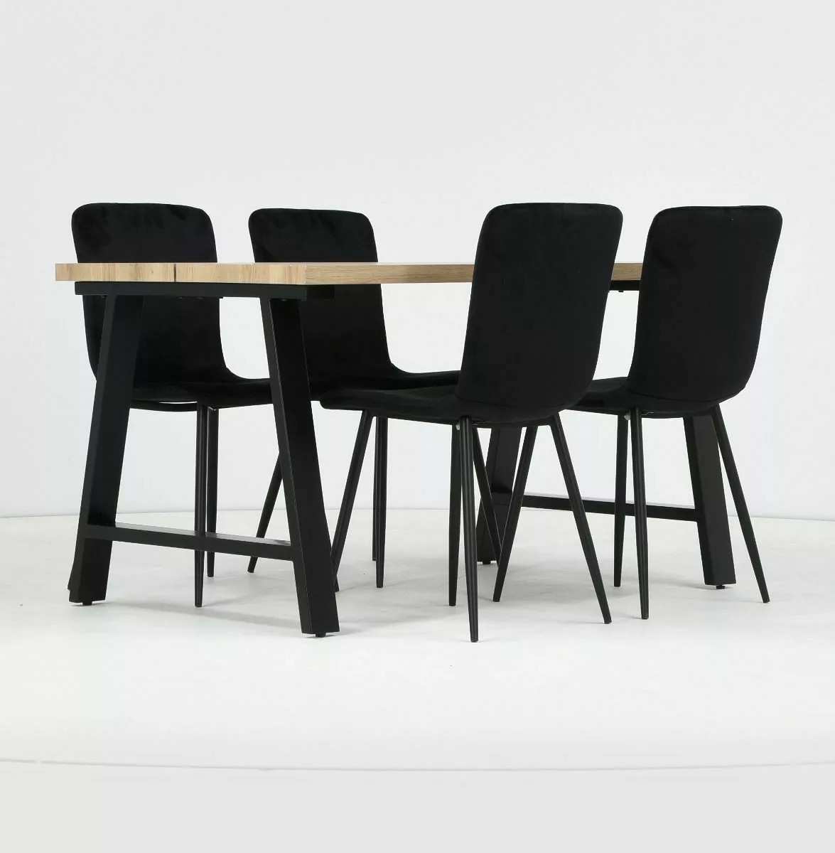 Kielo ruokailuryhmässä on tukeva metallijalka mustan ja tammen väriyhdistelmällä sekä neljä siroa kangastuolia.