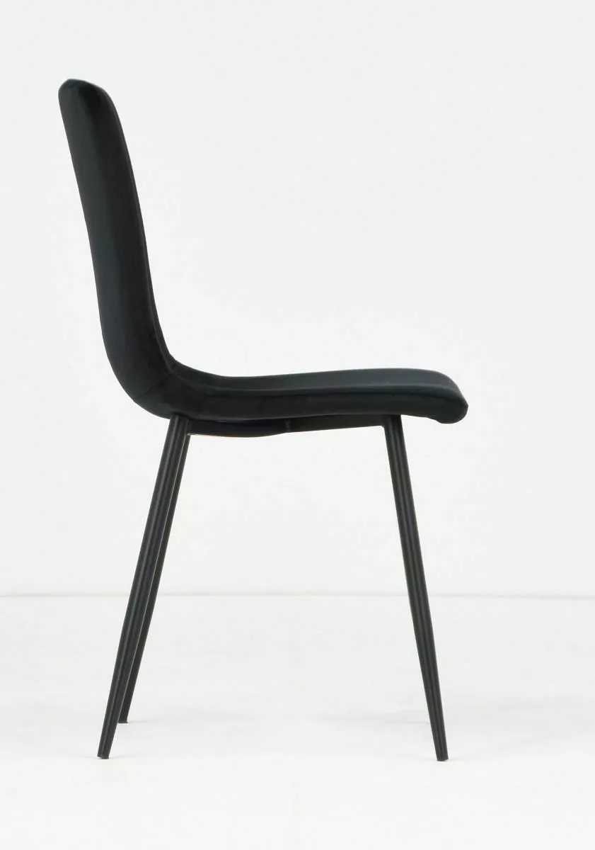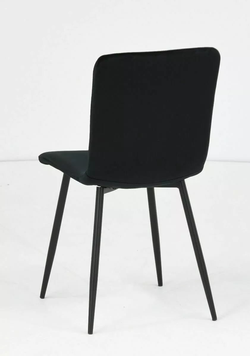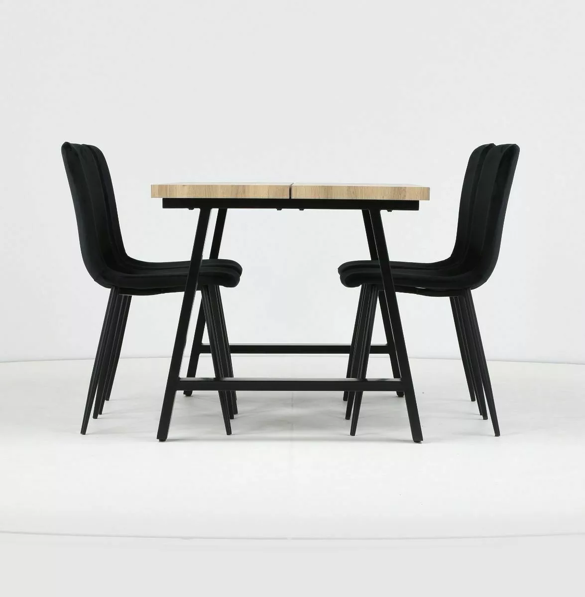 Kielo ruokailuryhmässä on tukeva metallijalka mustan ja tammen väriyhdistelmällä sekä neljä siroa kangastuolia.