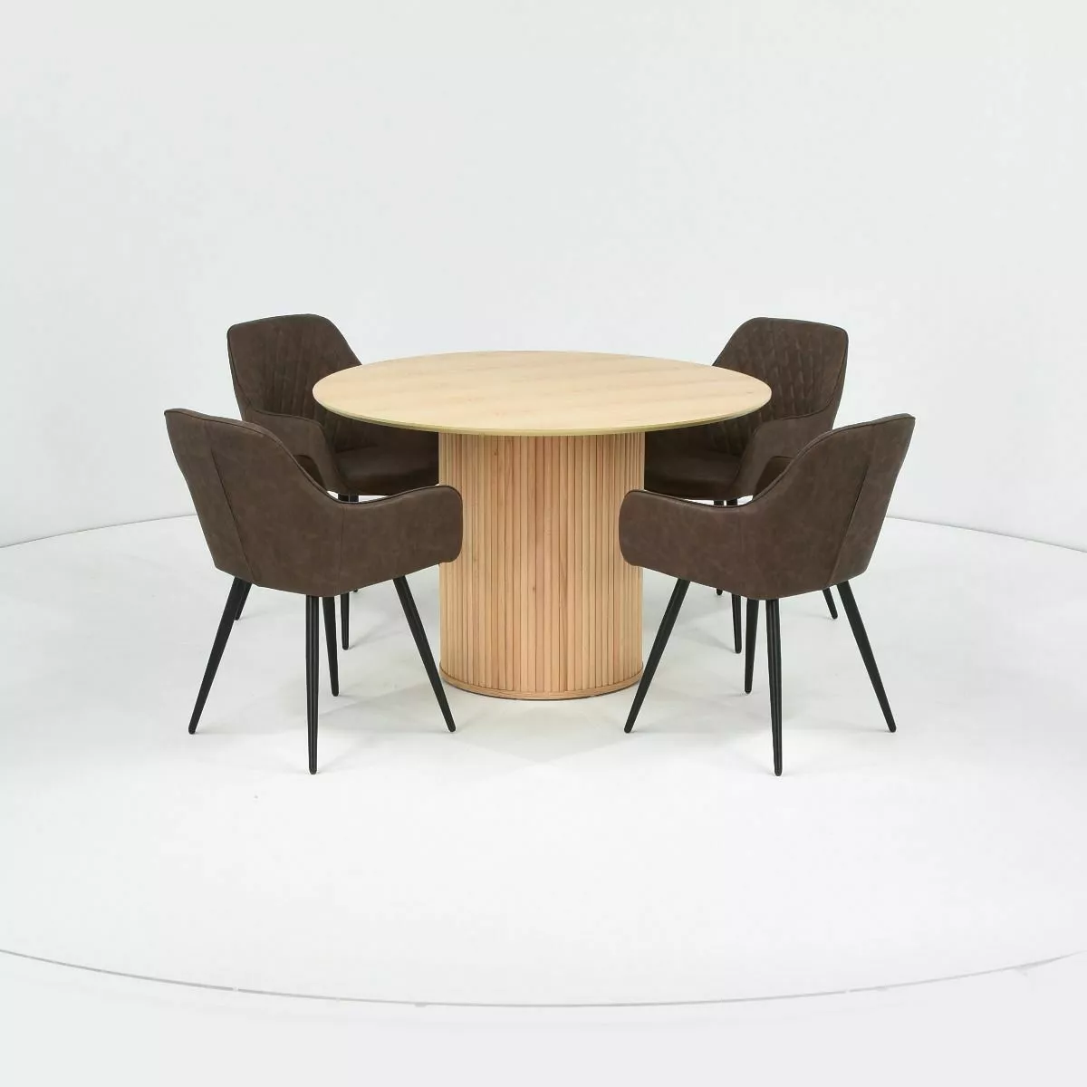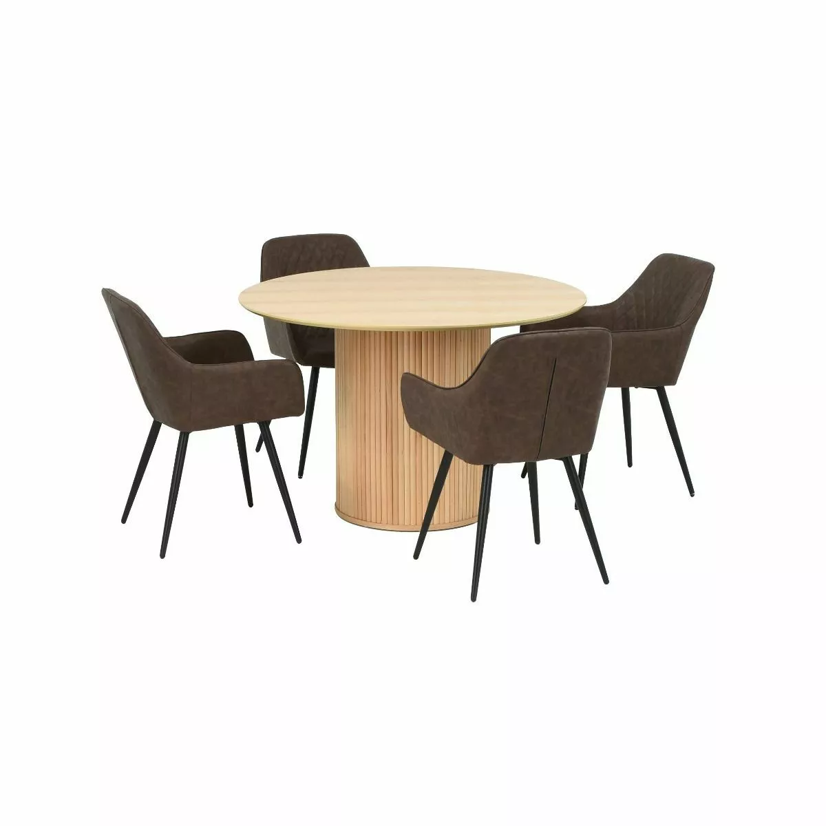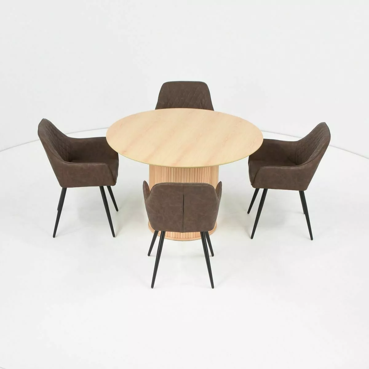 Verso ruokailuryhmässä on tukeva pyöreä pöytä sekä neljä keinonahkaverhoiltua tuolia.