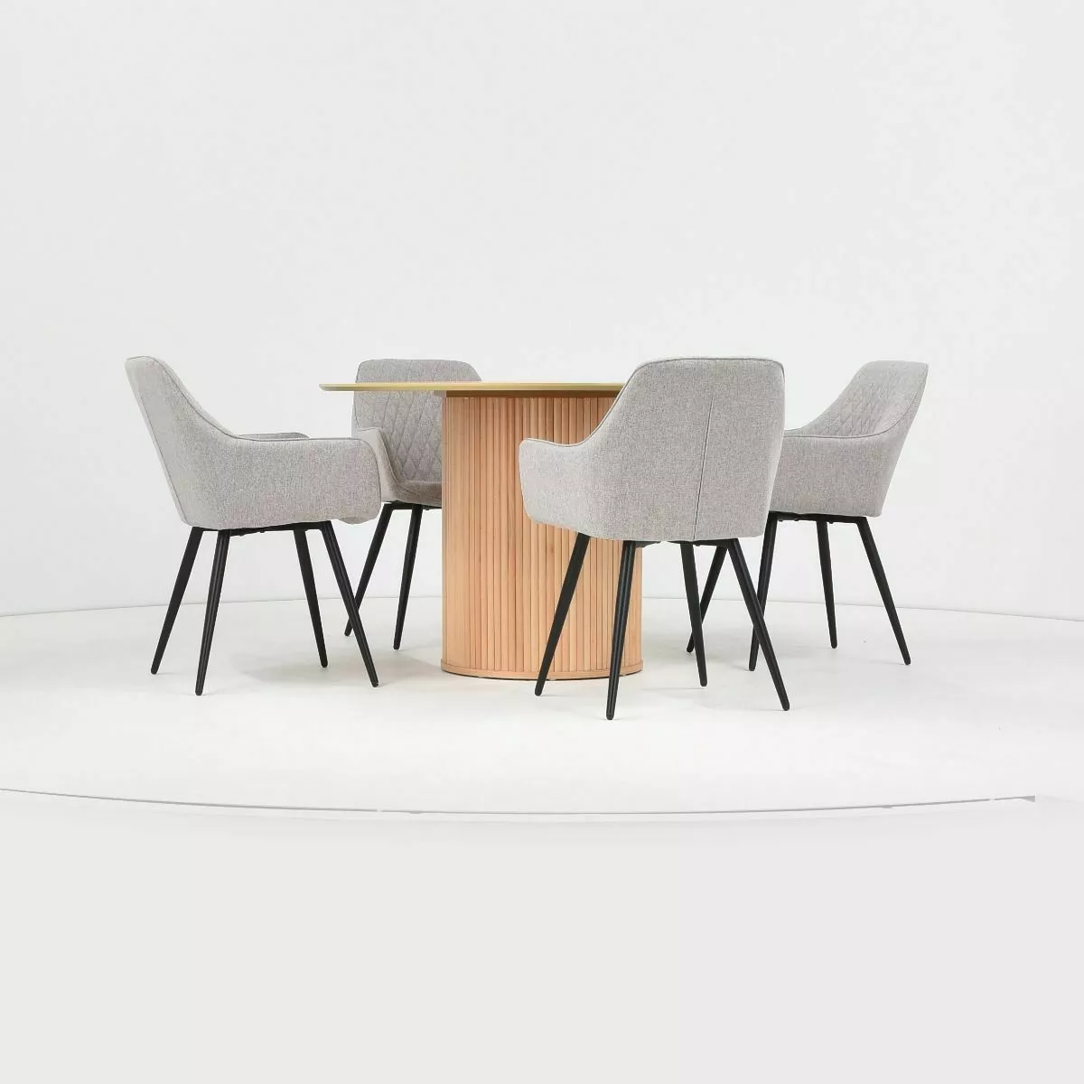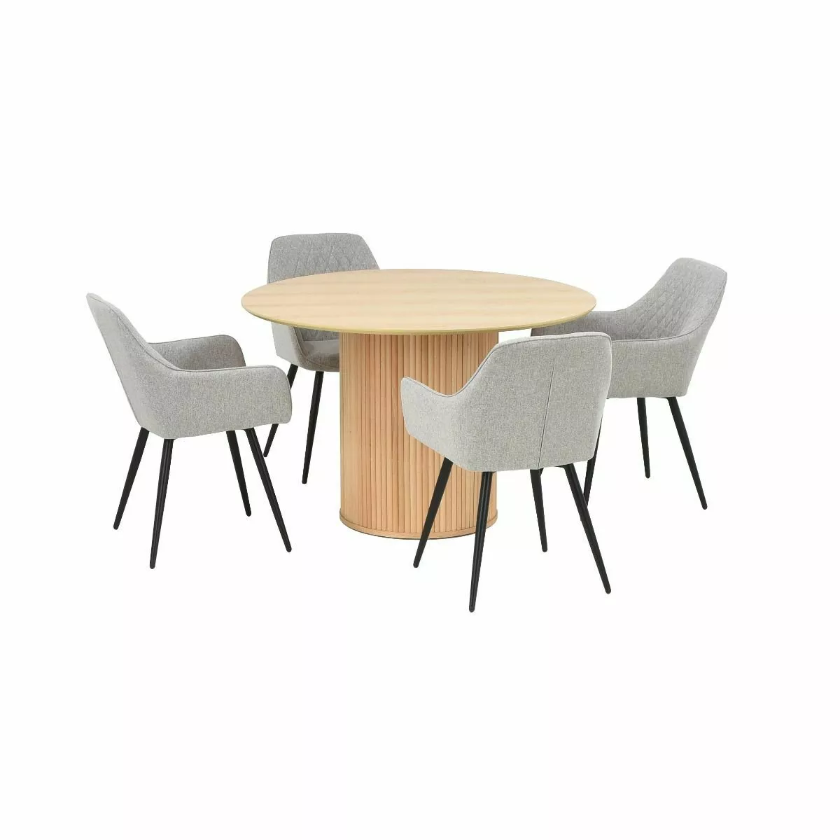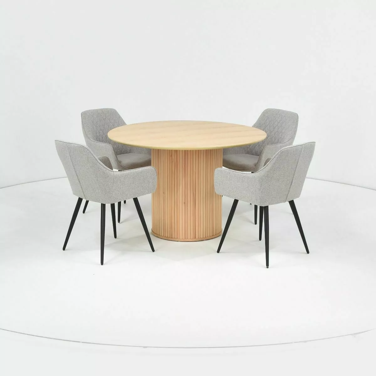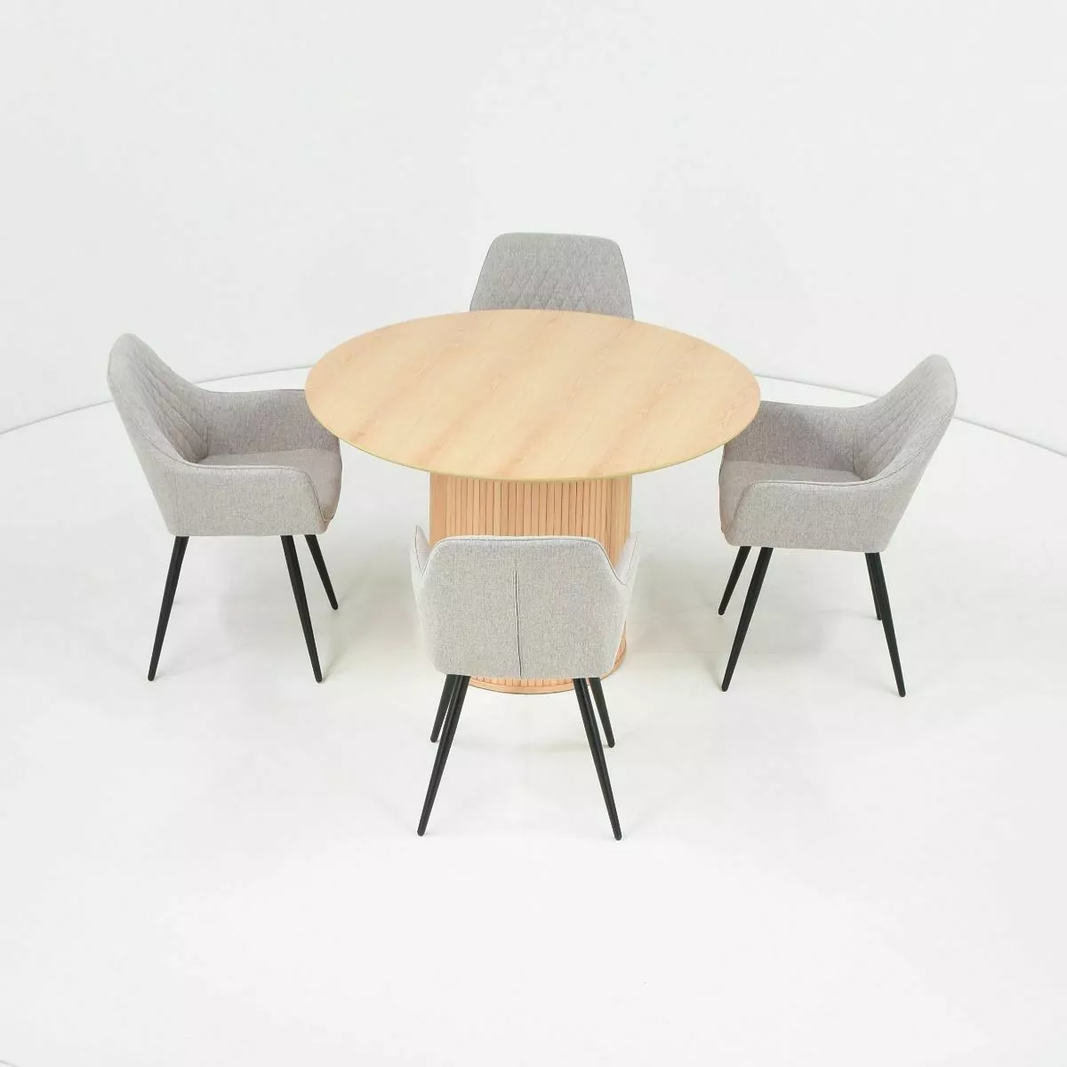 Verso ruokailuryhmässä on tukeva pyöreä pöytä sekä neljä kangasverhoiltua tuolia.
