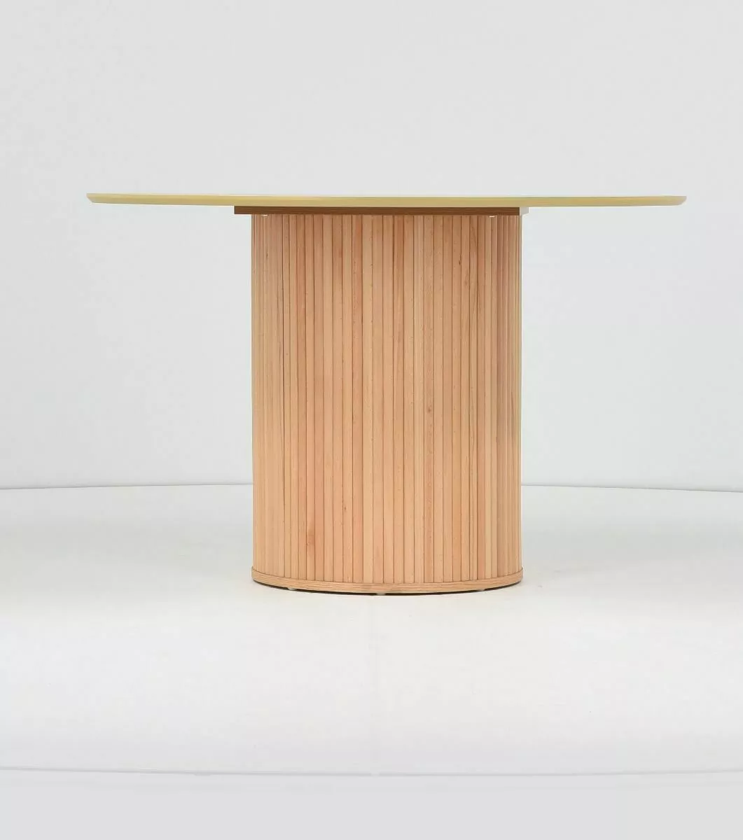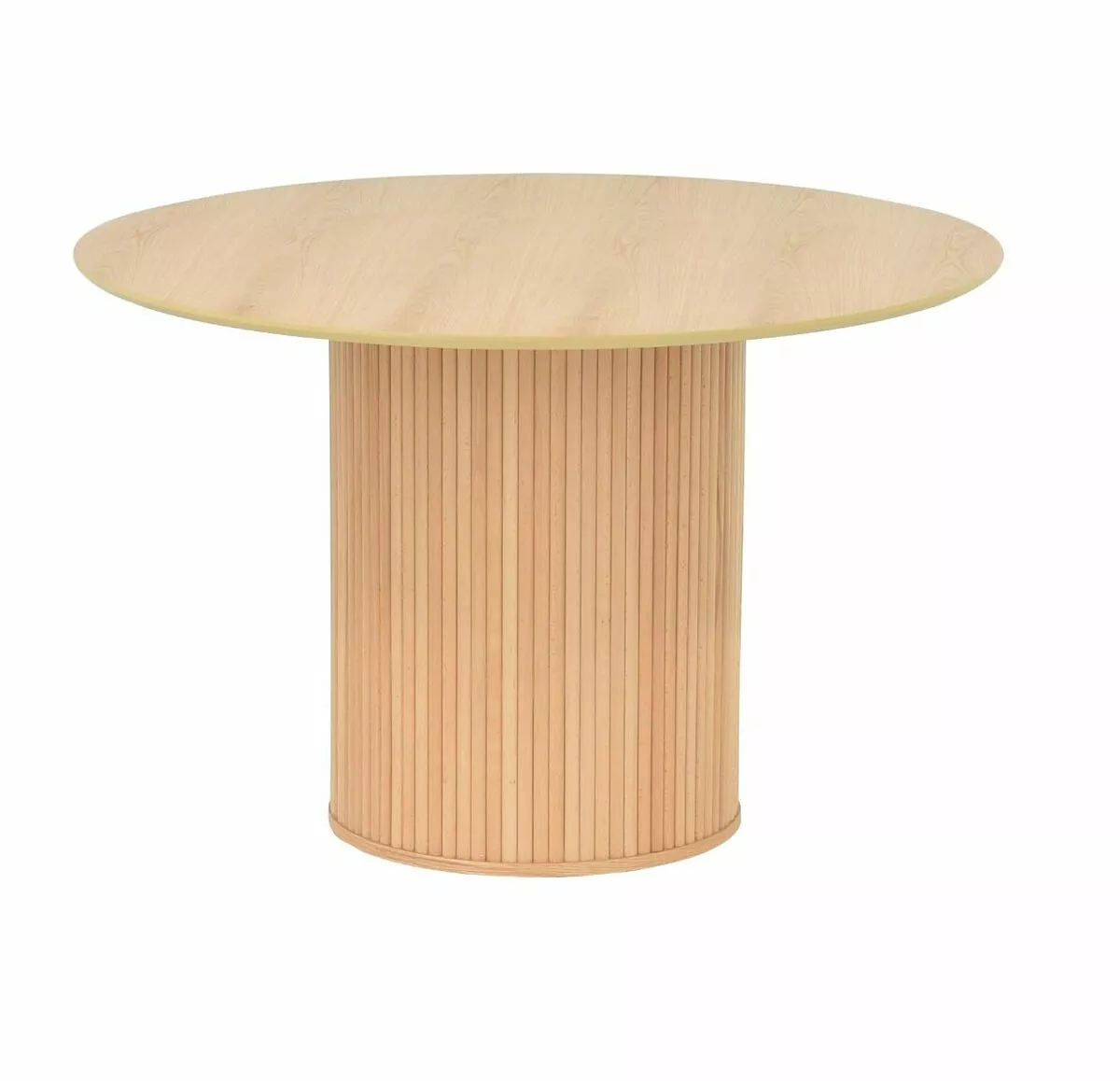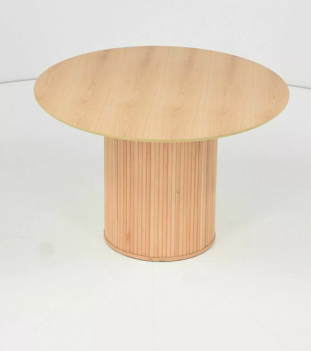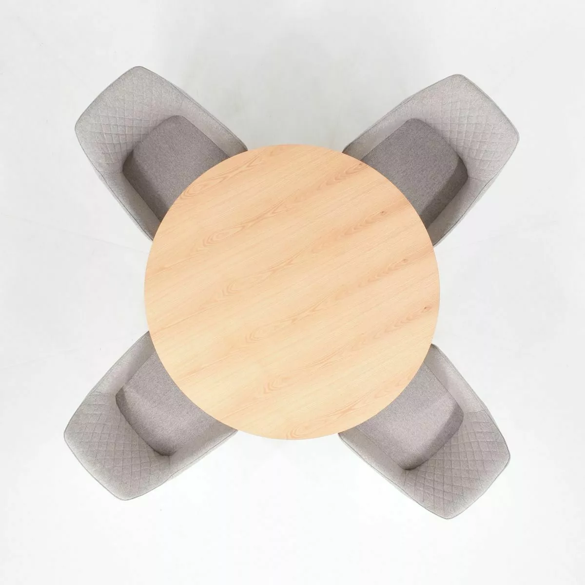 Verso ruokailuryhmässä on tukeva pyöreä pöytä sekä neljä kangasverhoiltua tuolia.