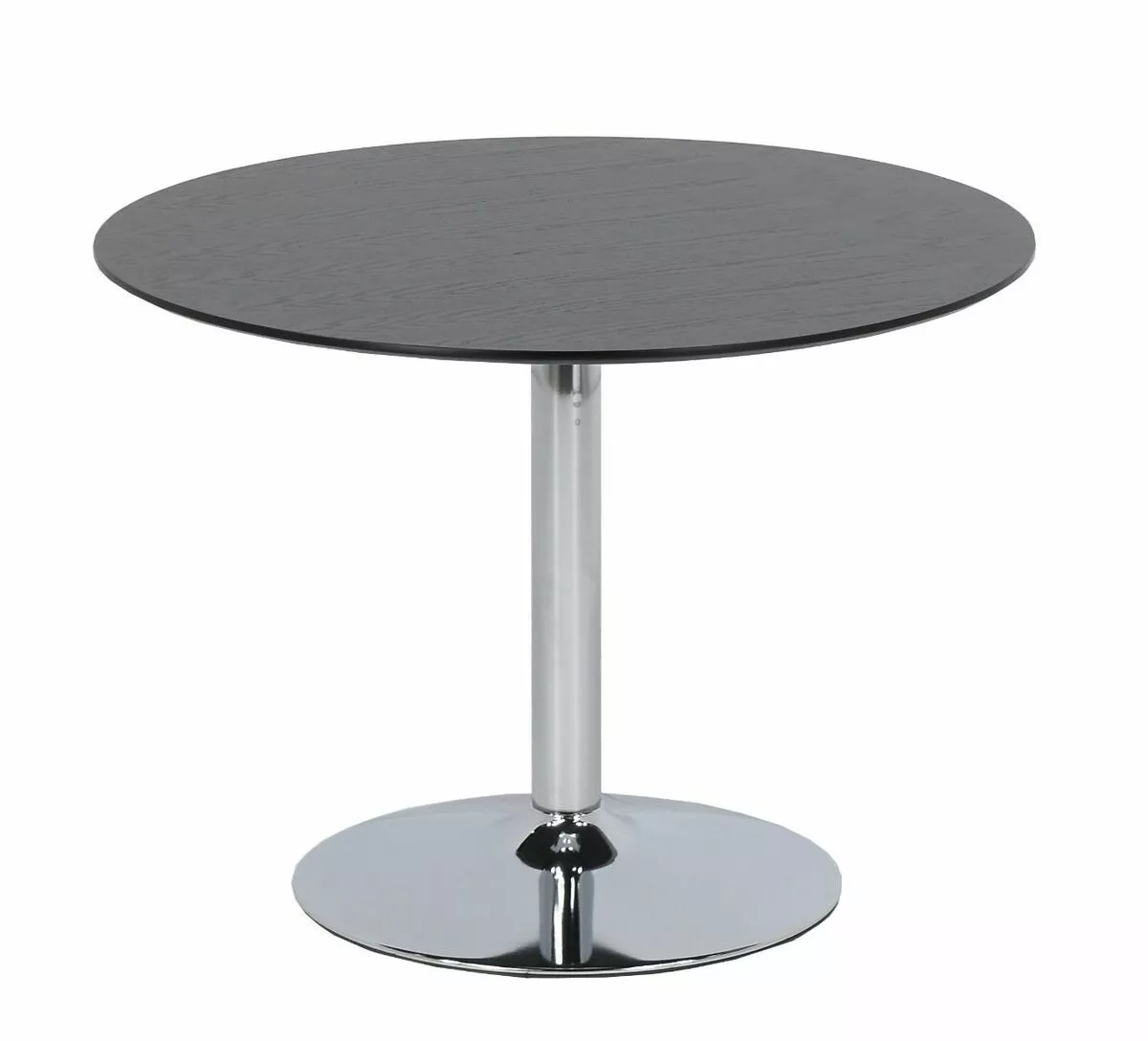 Pyöreän muotonsa ansiosta ruokapöytä sopii monenlaisiin tiloihin, myös pieniinkin, ja sen ympärille mahtuu mukavasti neljä tuolia.