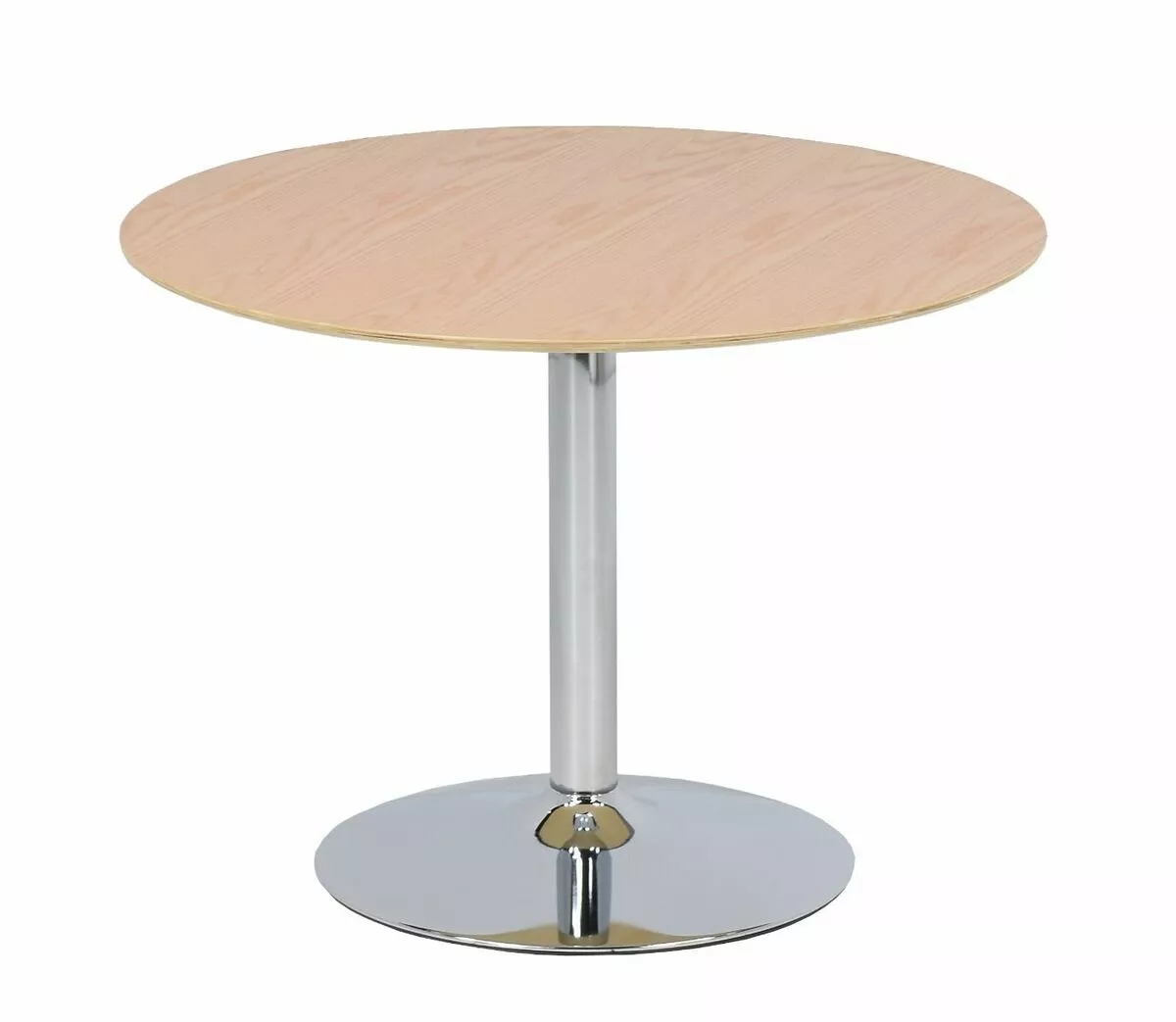 Pyöreän muotonsa ansiosta ruokapöytä sopii monenlaisiin tiloihin, myös pieniinkin, ja sen ympärille mahtuu mukavasti neljä tuolia.
