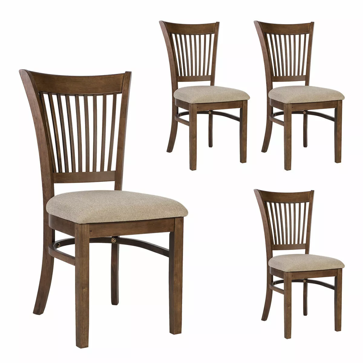 Pähkinäpetsatut Joy ruokatuolit pehmustetuilla ja kangasverhoiluilla istuinosilla.