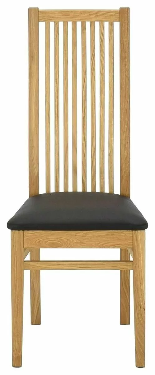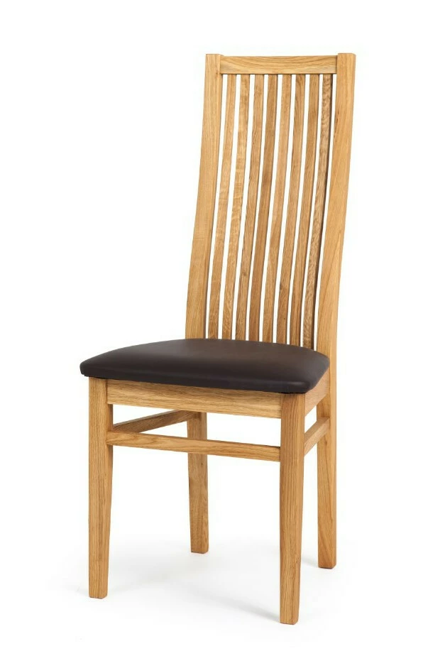Modernisti ajaton Sandra ruokatuoli on valmistettu massiivitammesta. Selkänoja kaareutuu kauniisti ja antaa hyvän tuen koko selälle. Tuolin pinta on viimeistelty puolikiiltävällä lakalla. Istuimessa on pehmustettu, keinonahkaverhoiltu istuin.
