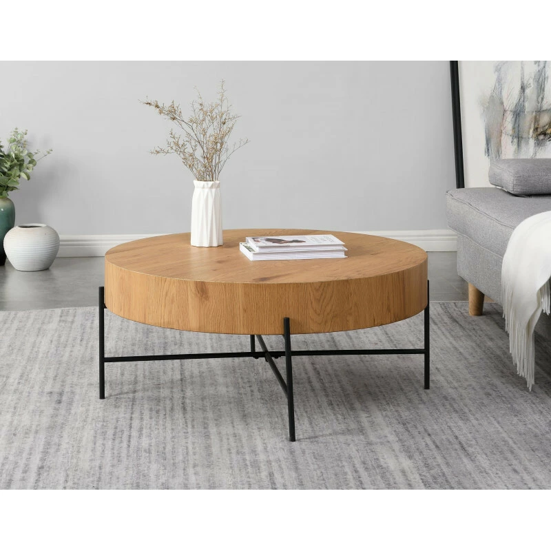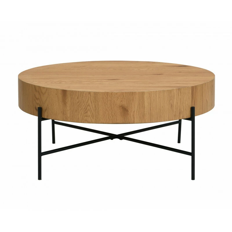 Moderni Pigeon sohvapöytä paksulla, pyöreällä kansiosalla sekä siroilla metallijaloilla.