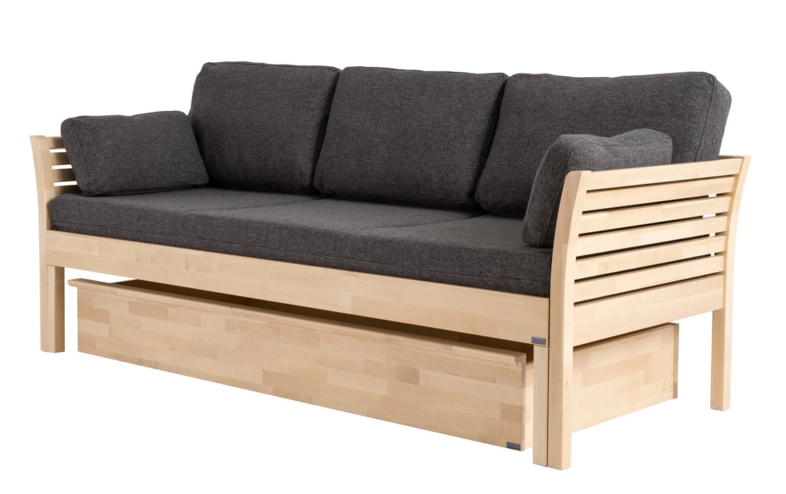Tarkalla käsityöllä ja uusimmalla tekniikalla valmistettava kotimainen Kanerva laverisohva on turvallinen valinta kotiin, mökille ja myös julkitilakalusteeksi. Vuodevaatelaatikko ja patjasarja myydään erikseen.