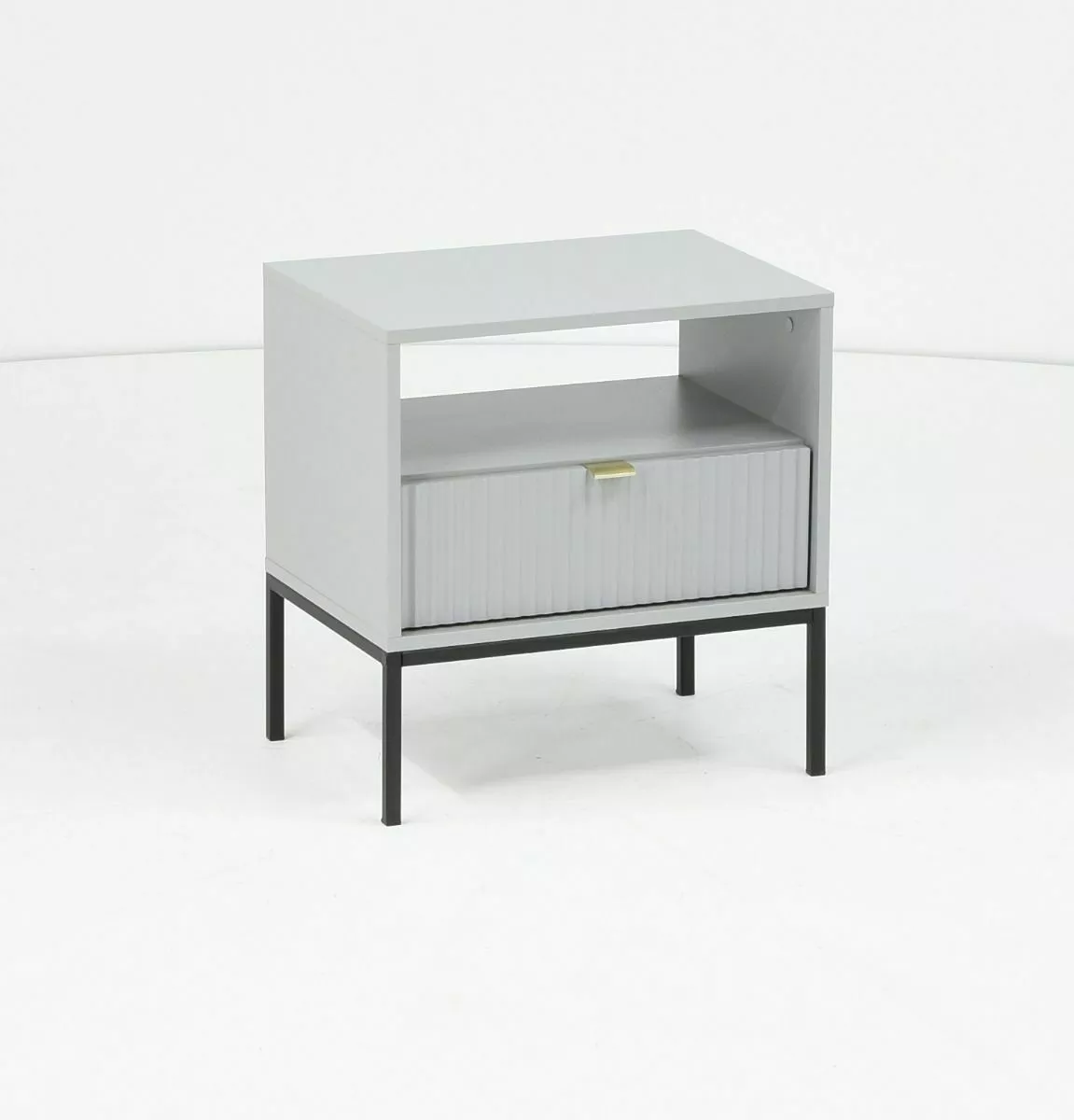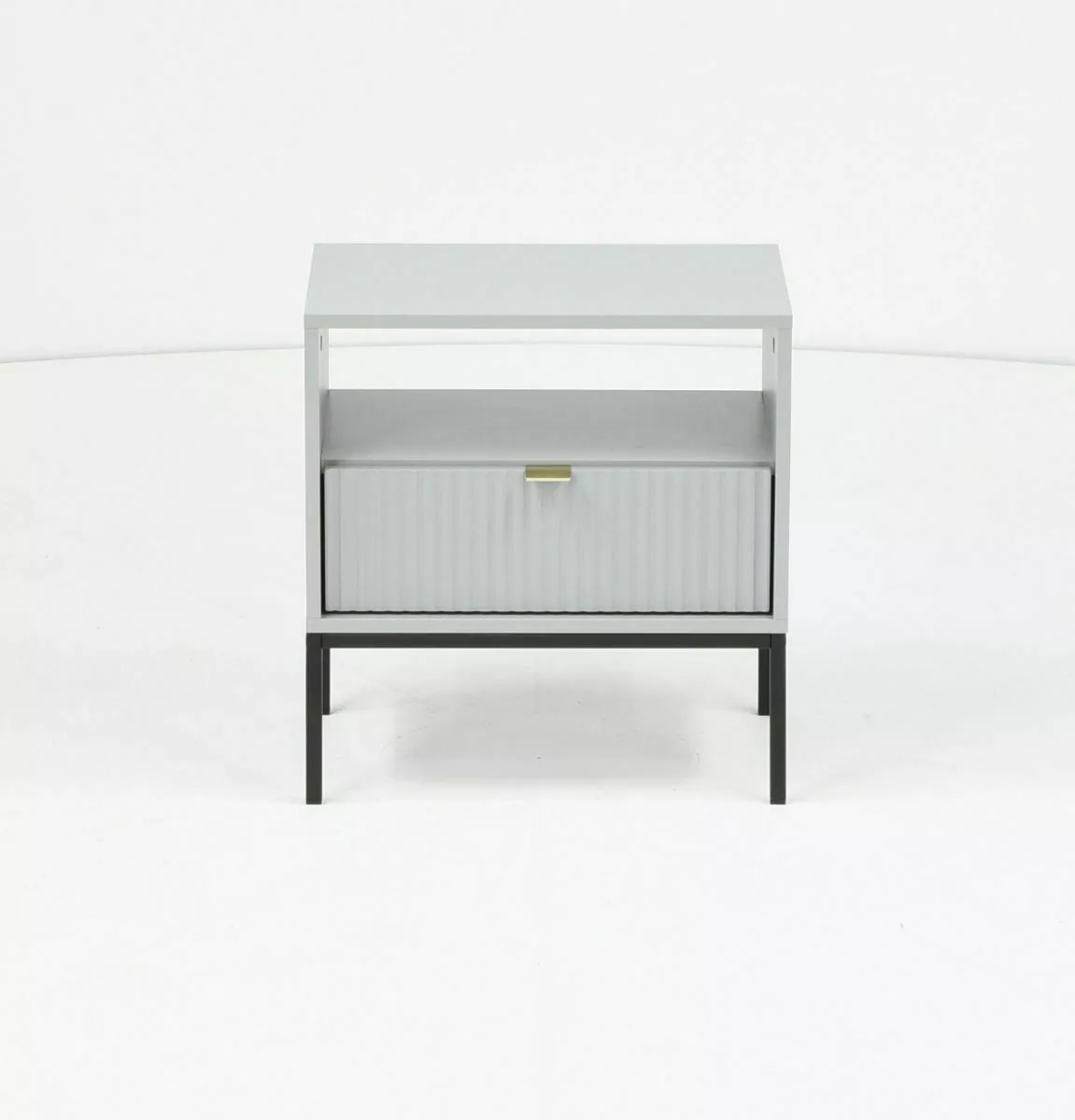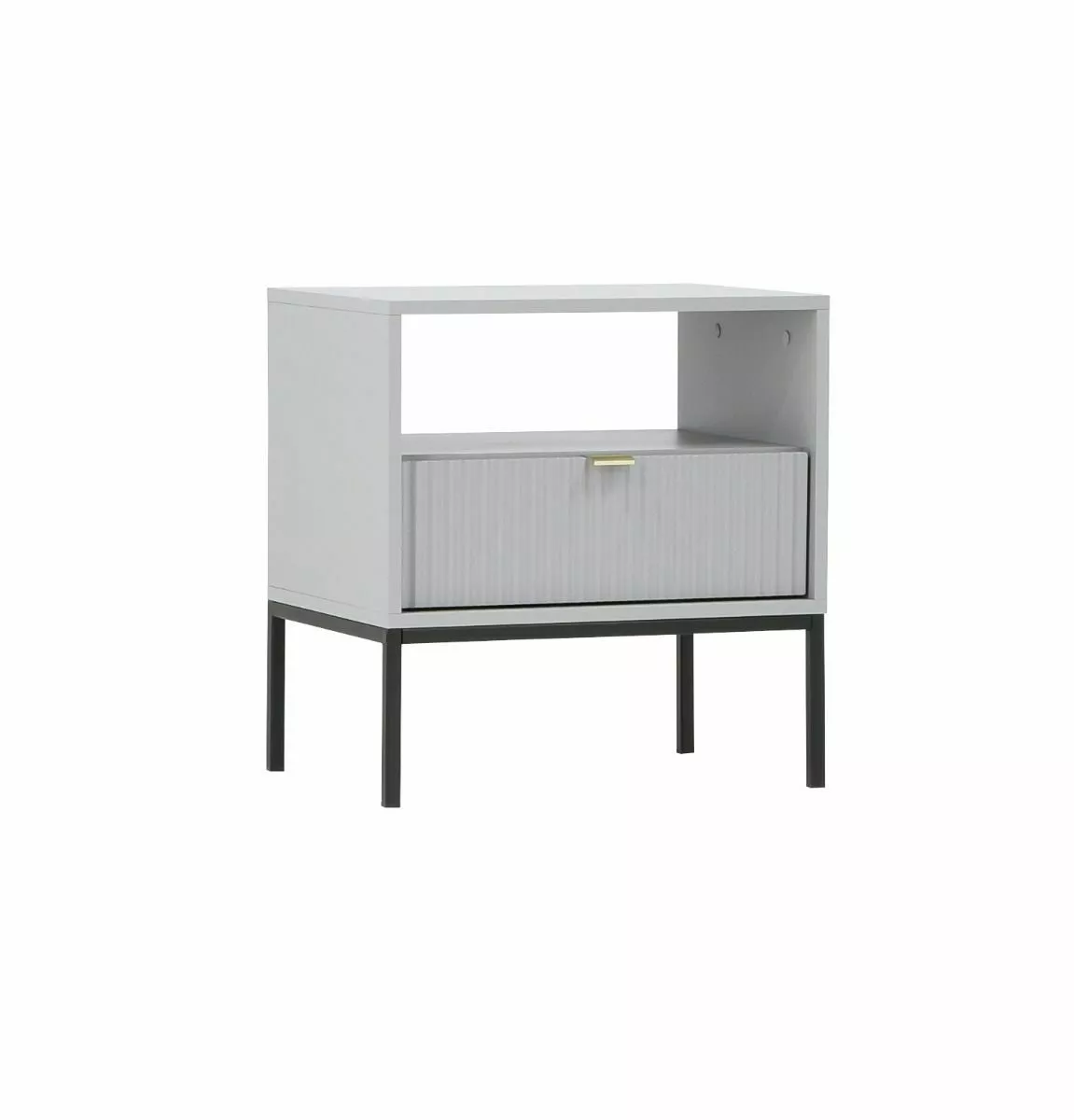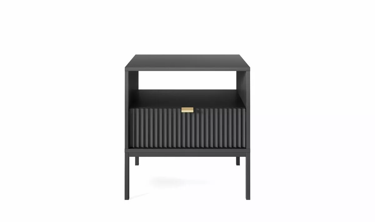 Tyylikkässä ja sirossa Latte yöpöydässä on yksi vetolaatikko ja tilava avotaso. Etusarjoissa olevat urat antavat kauniin, yksilöllisen ilmeen. Saatavana mustana tai greigenä.
