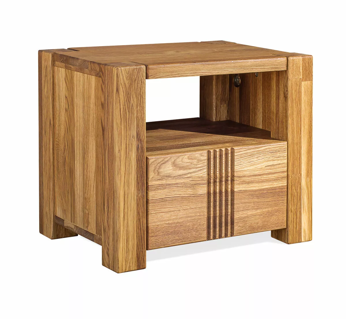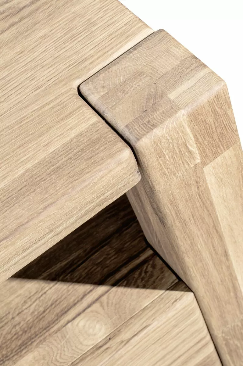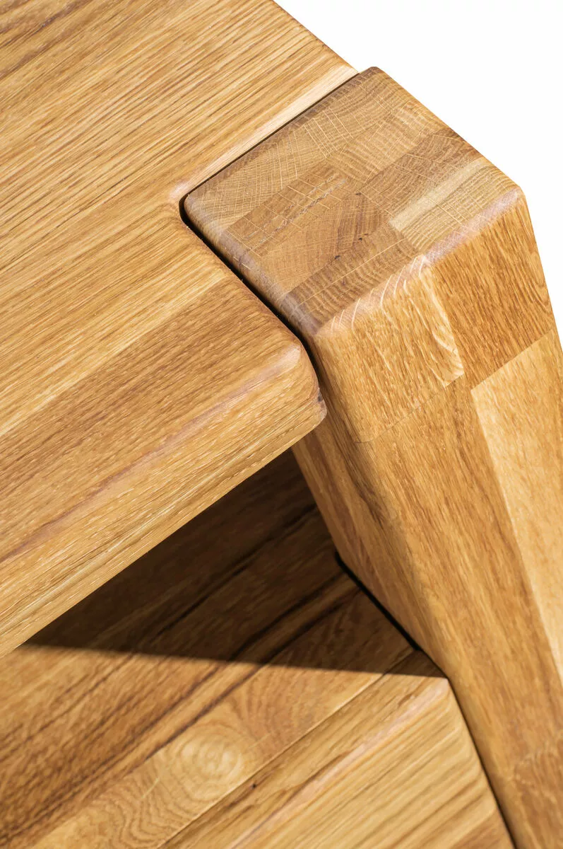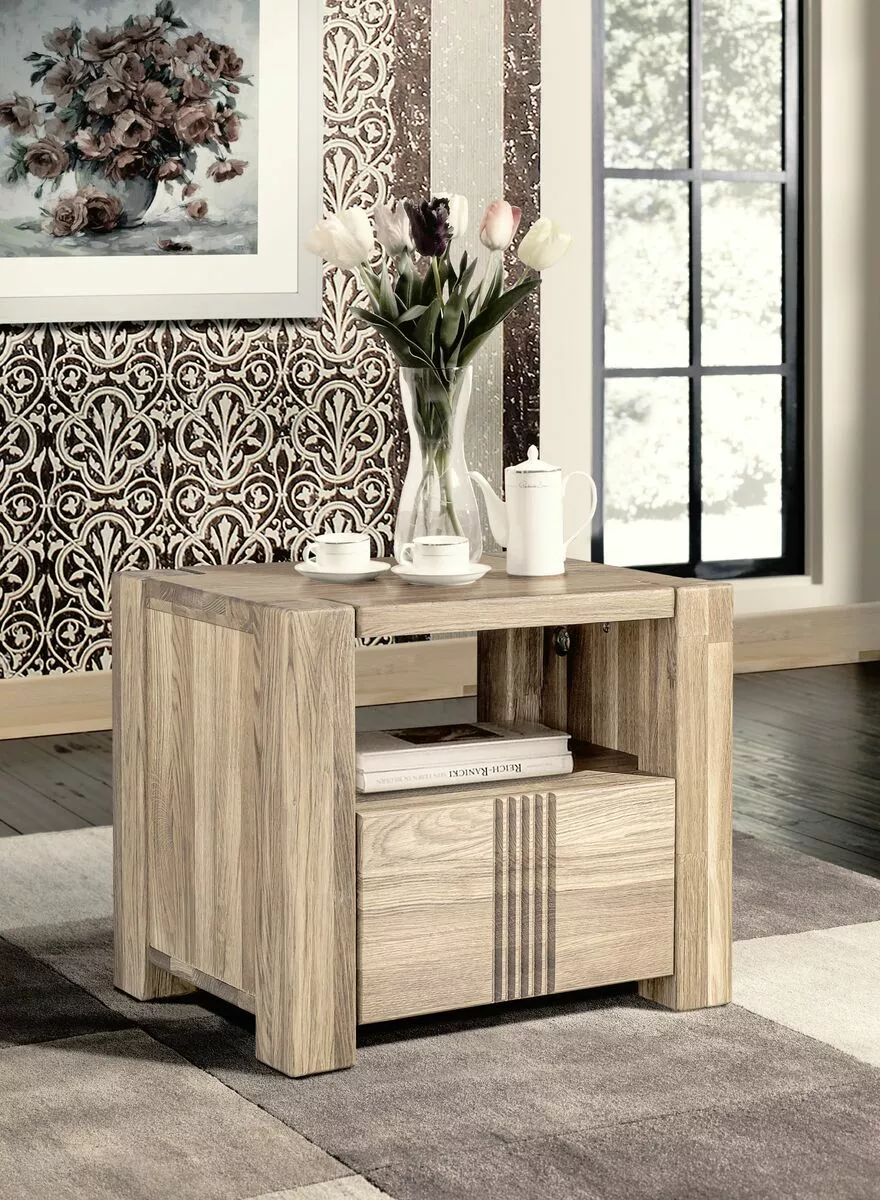 Massiivitammesta valmistettu Valeria yöpöytä avotasolla ja vetolaatikolla. Yöpöytä on valmistettu massiivitammesta, jonka pinta on viimeistelty puuöljyllä. Laatikossa on herkästi liukuvat metallikiskot. Tuote on saatavana kolmella eri petsisävyllä.